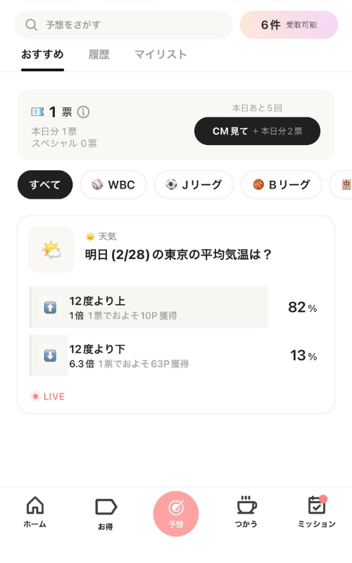 日常の出来事やニュース、何かしらの試合の勝敗などに対して予想を投票し、その結果に応じてポイントを得ることができる機能です。