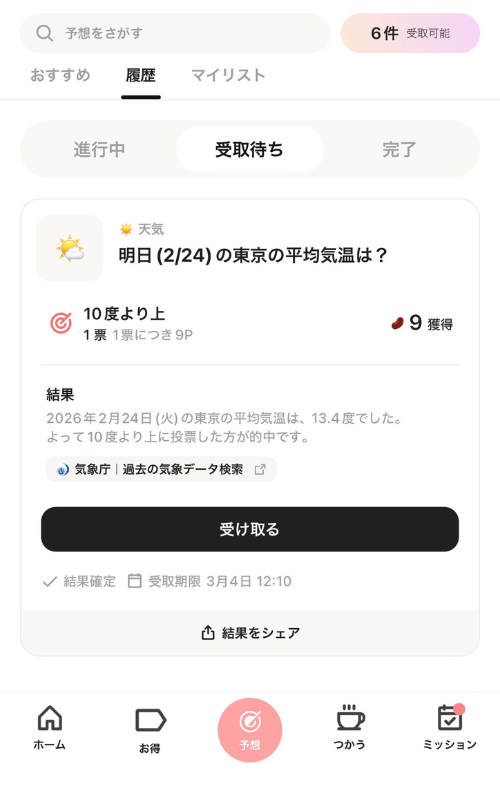 「予想」→「履歴」のページから、「受取待ち」のタブを選択し、受け取りたい予想の「受け取る」ボタンをタップします。